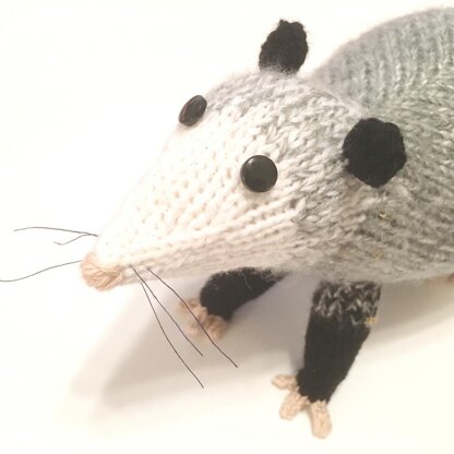 Owen's Opossum is knit in the round, and measures 12 inches long if you don't count his tail. He sits on his back legs, has a little pink nose, and little pink toes on each of his four feet. Darned if he aint irresistible. :-)