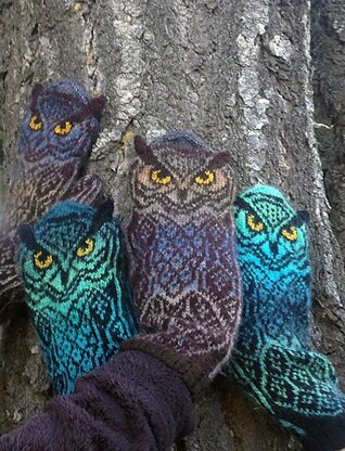 Owl mittens with knit-on ears. The PDF has longer and shorter mittens option. There are also some owls needing coffee (on the very last page). You can knit them in straight or negative colors; in latter case you may also need to embroider the pupils dark.