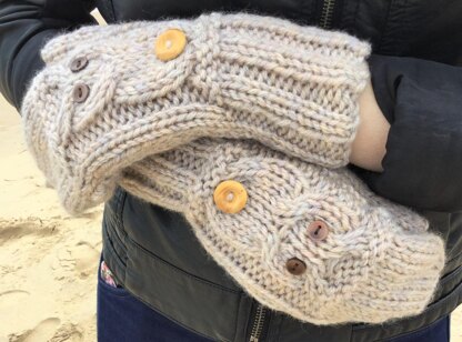 An intermediate knit, with simple cabling. Line by line instructions in English with British and American terms. Photos have been included to help knit the flap and to assemble the mitts. Knit flat on two needles and sewn up. Yarn recommendations are given, but most chunky/bulky yarns should be okay - just check your tension/guage.