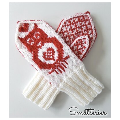 Dette er en strikkeOPPSKRIFT for barnevotter med uglemotiv i str 3-4 og 5-6 år. Mønsteret har i tillegg til skriftlige instruksjoner, bilder og diagrammer. Krever middels gode strikkekunnskaper.