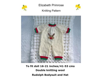 Knit our Rudolph the Reindeer Bodysuit and Hatfor Dolls 16-21 inches or 41-53 cms or Baby up to 3 months old.