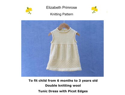The dress has a repeat pattern to the bottom of the skirt and picot edgings. The front and back are knitted separately on straight needles and sewn together. Stitches are picked up to complete the neckline and armhole edges.