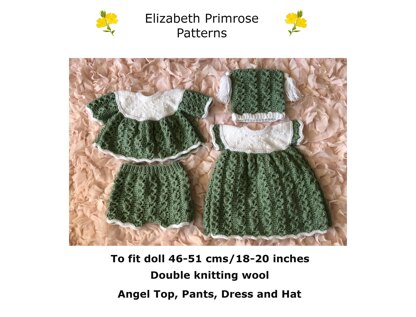 The outfit has a crossover ladder pattern and the Dress, Angel Top and Pants have a wavy edge. The teabag design Hat is finished with tassels. The front, back and sleeves of the Dress and Angel Top are knitted separately and slipped onto the same needle to complete the yoke. Stitches are picked up for the button bands.