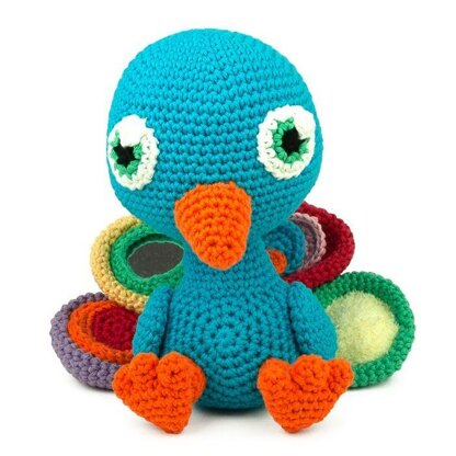 Materials Crochet needle (4,5 mm) Blue yarn (for instance Drops Paris - 10) Purple yarn (for instance Drops Paris - 05) Yellow yarn (for instance Drops Paris - 35) Red yarn (for instance Drops Paris - 12) Green yarn (for instance Drops Paris - 11) Orange yarn (for instance Drops Paris - 13) Pink yarn (for instance Drops Paris - 20) Black yarn (for instance Drops Paris - 15) White yarn (for instance Drops Paris - 16) Fluffy yellow yarn (for instance Scheepjes Softy - 499) Fiber fill Crackling foil Mirror sheet