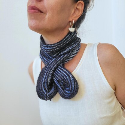 The unique part in this brioche scarf is the use of cables placed at certain positions. The rounded end and the cables allow to pull the second end through or you knit a longer version which can be knotted and leaving the ends as a decorative element.