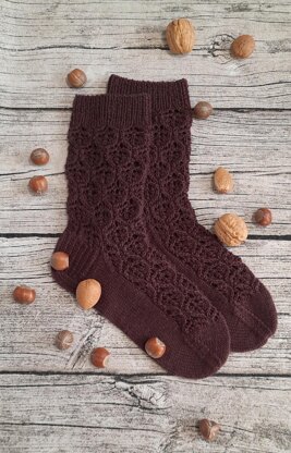 The Finnish word Pähkinä means nuts. And these socks are designed for all of you who are nuts about lace knitting. The moderate lace pattern is worked during every round to keep your mind occupied. The result is delicately beautiful and light due to light fingering weight sock yarn.