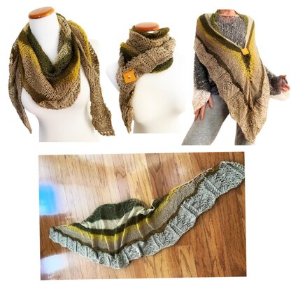 The Paisley shawl in a crescent shape is knitted top down with a lovely ever increasing over sized eyelet edge. The Sublime yarn as shown gives it lots of personality and the bottom border is done with a wonderfully understated Herringbone stitch pattern, which frames the shawl beautifully. The pattern is fully written and also offers a chart for the border. The size is 77” in overall length and 18” in middle height, when knitted to gauge.