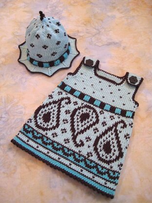 Get your fair-isle mojo going with this beautiful baby dress and hat! The dress is begun with a provisional cast-on, worked in the round to the armholes, then worked flat to the shoulders. The bodice fleck stitches are worked in duplicate stitch. A single crochet edging is worked around the bodice top and armholes. This pattern includes charts for both the dress and hat.