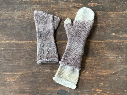This pattern includes instructions for fingerless mittens as well as full mittens — with the full mittens a little longer in the cuff than the fingerless mittens, and finished with a Kitchener bind off at the top for a nice rounded shape. For the fingerless mittens, the pinkie side/ outside is knit longer than the index finger side. The cuff length extends well past the wrist for that extra coverage, but is shorter than the full mittens for a fun layered look when worn together.