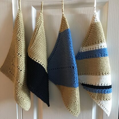 Here's my new set of 4 hand knitted dishcloth patterns. Two of these patterns are worked as a 'mitred' squares & the other two as a diagonally knitted square. I've played around with eyelets & colour changes in these new patterns. Use colours similar to mine (cream, sand, black & blue) or change to your own colours to co-ordinate with your decor!