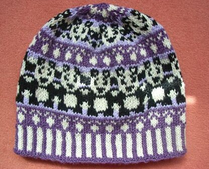 This will be a surprise for another work collegue. I created it after I had asked her about her favorite animal and favorite colour. Panda and violett was the answer. Here is the result. A band of pandas is all around the body of the beanie. The peerie consists of white paw prints. And seven panda faces are at the top with a nice star-like finish. You can see it in the pictures.