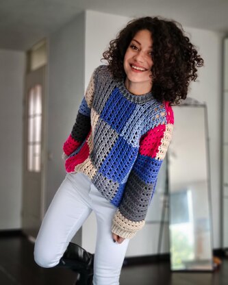he Pane Sweater has a modular construction. The first section or row with squares (rectangles) is worked in one single piece, changing the color after completing the required number of rows for one square (rectangle). Second section and the following ones are worked in the same way, only that they are joined as you go with the previous section’s side rows.