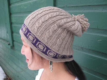 The Pangloss hat offers the "best of all possible worlds" with both simple stranded colorwork and cables. The hat is worked from the bottom up beginning with an easy 2-color target design flanked by garter stitch. The cable and rib pattern is worked with larger needles for a slouchy fit. The hat is finished with a pompom for a touch of whimsy. This pattern coordinates with the Pangloss Mitts and if worked together, only 3 skeins of the main color and 1 skein of the contrasting color are required. The colorwork portion is charted and both charts and written instructions are provided for the cable and rib pattern.