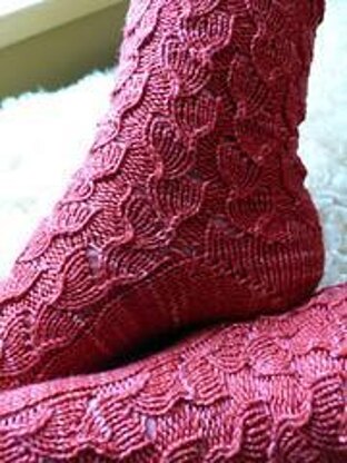 Wavy rows of nodding poppies trail down the leg and over the foot of this top-down sock in four sizes XS(S, M, L). Yarnovers and decreases create an undulating rib that mimics the gentle motion of this bright spring flower. Pattern is not reversible for toe-up construction.