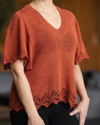Paphia Tee is a butterfly-sleeved and V-necked summer tee that features a simple lace pattern on sleeves and hem. It is worked seamlessly from the top-down, first flat, then in the round.
