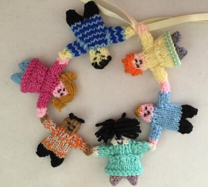 How cute is this! A parade of small children, holding hands together, from one end of crib to the other! Babies love to lay and look at the bright colors of dolls hanging up! Hang also on babys bedroom wall. We used a satin yarn to tie on to crib sides. Each doll in knit , one by one, but easy to knit. Then add small features, and you can start sewing the hands together of each doll to create a parade! Uses scraps of worsted weight yarns, knitting needles, US # 4. Doll are about 3 inches tall , individually. Why not make up a basket of these dolls and place in the family room. When a child comes to visit, let them play with the dolls then they get to take one home!