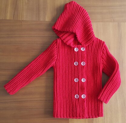 This child’s double-breasted jacket has set in sleeves and a hood, and is worked in a textured rib stitch. Warm and stretchy, it will suit both boys and girls.