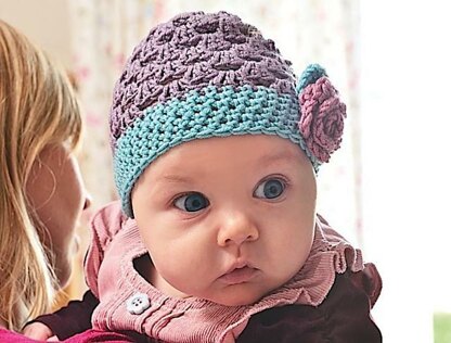 A feminine hat ideal for a baby girl. This could easily be tackled by someone who has mastered the basic crochet stitches or a granny square.