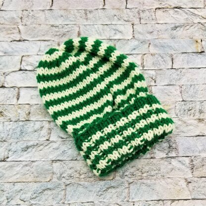 The Parks Creek Teen Hat Knitting Pattern is a quick & easy basic beanie pattern with enough ribbing to turn up for a cuff. The Parks Creek teen knitted hat features two colors of yarn to create its narrow striped detail.
