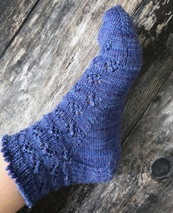 The all over lace pattern and picot cast-off add a fancy edge to the design. Quite literally. The socks work best in semi-solid yarn to really show off the delicate lace detail, as variegated yarns can bring too much party to the sock and overwhelm the design.
