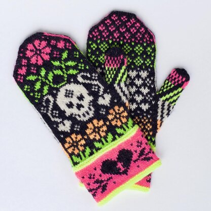The Party Bones mittens were inspired by the Day of the Dead. This beautiful celebration is a commemoration of lost family and friends. It is rich with color, tradition, and love. These mittens were designed with all three in mind. These mittens are worked from the bottom up in the round using stranded colorwork. You will work with 2 strands of yarn throughout this pattern. You will never have to use more than 2 strands. This pattern provides instructions for knitting an unlined or lined version.