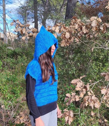 This sleeveless top with a hood is worked from bottom up in stockinette stitch. In the round until armholes, then flat for the top of the front and back. Once shoulders are joined, you have to pick up stitches for the hood.