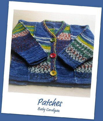 This adorable cardigan is knitted in strips which are in turn knitted together. The self patterning sock yarn works up in a unique patchwork design.
