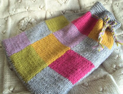 This is a pattern for the Patches Hot Water Bottle Cover, part of the Make at Home range of patterns and kits. This is made using a very simple intarsia at the front, plain stocking stitch at the back and garter stitch at the top. It is secured with eyelets and a plaited tie. The yarn is Aran pure wool and wool/alpaca mix. This is a very easy project as soon as you ve mastered intarisa this is a really easy one to do. The colours are a soft grey base with rose, ochre, olive and cerise.