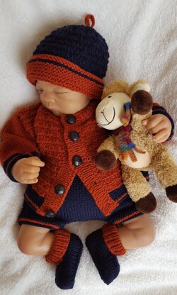 You will receive instructions to knit the Cardigan, hat with turn back brim, short trousers with drawstring waist and pull on booties