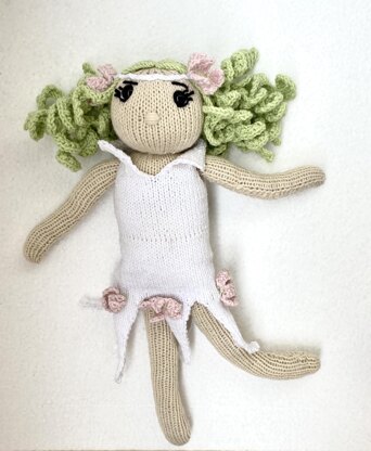Pattern: knitted doll with green hair and white dress,
