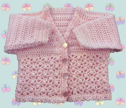 Lovely patterned panel crochet cardigan pattern. The back and fronts are made in one piece to the armholes so no side seams to sew up. Made in double knitting - any yarn can be used providing the tension is matched.