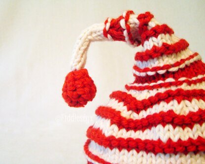 This fun stocking cap was inspired by red and white striped candy canes. Knit in the round, the stripes add color and texture. The ball on top is done in crochet. Don’t crochet? Simply make a tiny pom pom instead!