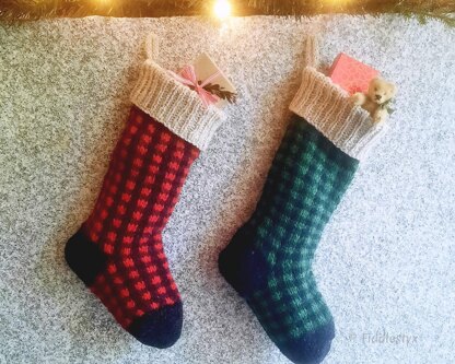 This stocking features a buffalo check plaid design created by using simple slipped stitches and only one color per row. It is knit in the round from the toe up with a short-row heel.