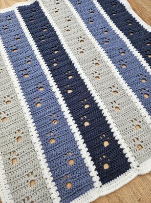 It uses DK yarn and a 4 mm hook but you can use any to suit your preference but this will alter the size of your blanket. It uses 400g in total. 100g of each colour. The finished size is 25 inches by 29 inches.