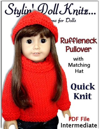 Pdf doll knitting pattern, fits 18 inch and American Girl dolls. Ruffle neck with matching hat.