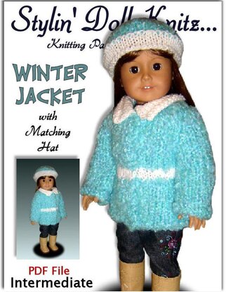 Pdf doll clothes knitting pattern, fits 18 inch and American Girl dolls. Winter Jacket and matching Hat.