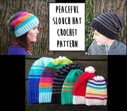 The Peaceful Slouch hat is unique because it has a comfy ribbed brim and is worked from the bottom up. The hat is made all in one piece with no seaming. The stretchy ribbed brim makes it easy to get the size just right for gift-giving. It's fun to crochet because it works up quickly and grows more beautiful with each stripe. It's easy to make it yours and play with color combinations to suit your style.