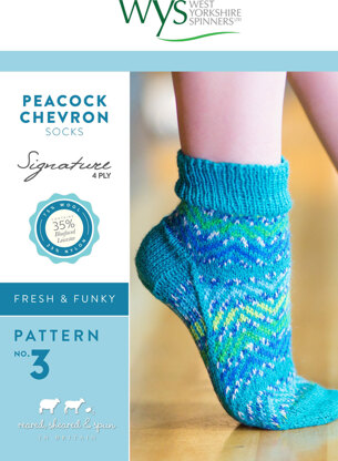 Peacock Chevron Socks in West Yorkshire Spinners Signature 4 Ply - Downloadable PDF is a Intermediate Knitting pattern by Emma Wright, available as a Downloadable PDF and includes instructions in English. Super fun to make, this pattern could be your next masterpiece!