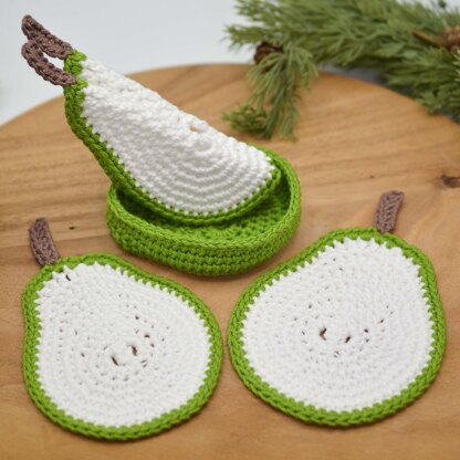 The fruit coaster family welcomes the pear slices set. This set makes a decorative and functional addition to your home. When each pear coaster is folded in half and placed in the little container, the set looks like a bowl of pear quarters.
