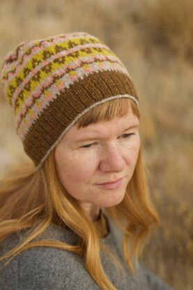 This hat begins at the brim with ribbing and is knit bottom up with a color work pattern and crown shaping.