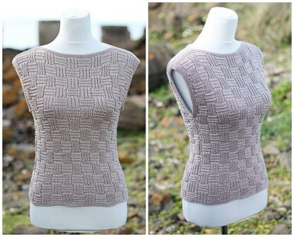 Composed of a beautiful textured pattern using DK yarn. Worked flat, bottom up. Front and back alike. Seamed at the sides and shoulders.