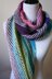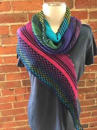PEEP Show is an asymmetrical triangular shawl that incorporates alternating striped and solid sections, a mosaic border, and an i-cord bind off.