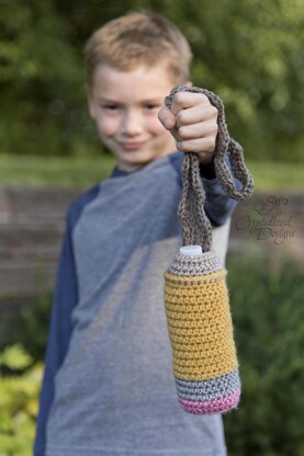 Crochet this quick and fun water bottle cozy! Button closure ensures water bottle won’t fall out no matter how hard children play! And the ‘scribble strap’ adds just all the more fun!