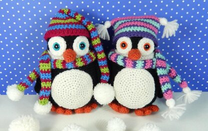 Pattern includes detailed instructions and clear photographs to help you create these friendly penguins, complete with their stripy hat and scarf ensembles.