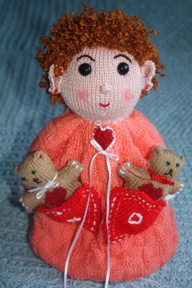 Penelope is an attentive mama! Not only is she a pajama mama- hiding nighties or pj;s in her skirt but she also has two wee teddies in her care Safely tucked into her heart shaped pockets, the two teddies are settled for the night and are oblivious to the fact that they have been created in one piece.. including the heart motif on their chest. The skirt of Penelope is lined to prevent stretching and is large enough to hold not only night garments but treasures that any little girl has in her bedroom. Could there be a better place to hide all her treasures from the prying eyes of bothersome brothers?. This doll takes one ball of yarn - approx. 330 yds and is an easy knit. The embellishments can be adjusted to your desire but the heart motifs give the Valentines Day Baby a nice glow.. even the heart shaped rouge hearts on her cheeks are adorable.