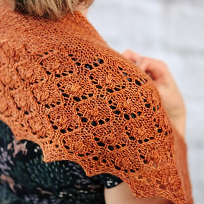 Penhale is a simple lace shawl worked straight along the long edge from the bottom up. It begins with a German twisted cast on for a stretchy edge and goes straight into the lace section. The stitch pattern is both written and charted. After working the three charts, the shawl is gently shaped in the upper garter section using short rows and cast off using the Russian bind off.