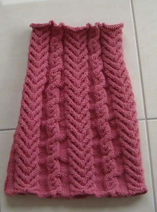 This knee length cabled skirt is worked in rounds so there are no side or back seams and it has a slightly tapered shape from the lower edge up to the waist. Being 12ply yarn, this skirt knits up quickly. It will be very warm and look extremely cute when teamed with tights or boots.