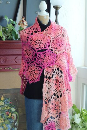 Lace weight wrap made with flower motifs is the perfect way to welcome Spring. It’s light, easy to keep with you for those chilly breezes. Peony Wrap will be stunning worn for the holidays over that special dress.