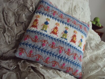 This is People Cushion Cover, part of the Make at Home range of designs. It is a folk inspired design, with fairisle on the front and stripes on the back. The yarn is aran. For a 40 x 40 cm cushion pad.