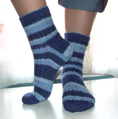 This pattern uses a simple eyelet rib pattern to create a lacy yet well fitting sock. This easily memorized stitch pattern looks great in solids, stripes and multi-color yarns.
